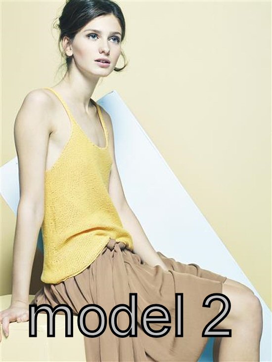 Model 2: Sofia top i str. (XS)S(M)L(XL)Overvidde: (80)86(94)100(109) cm, hel længde: (58 )60(62)64(66) cm, garnforbrug: (150)150(200)250(300) gram
